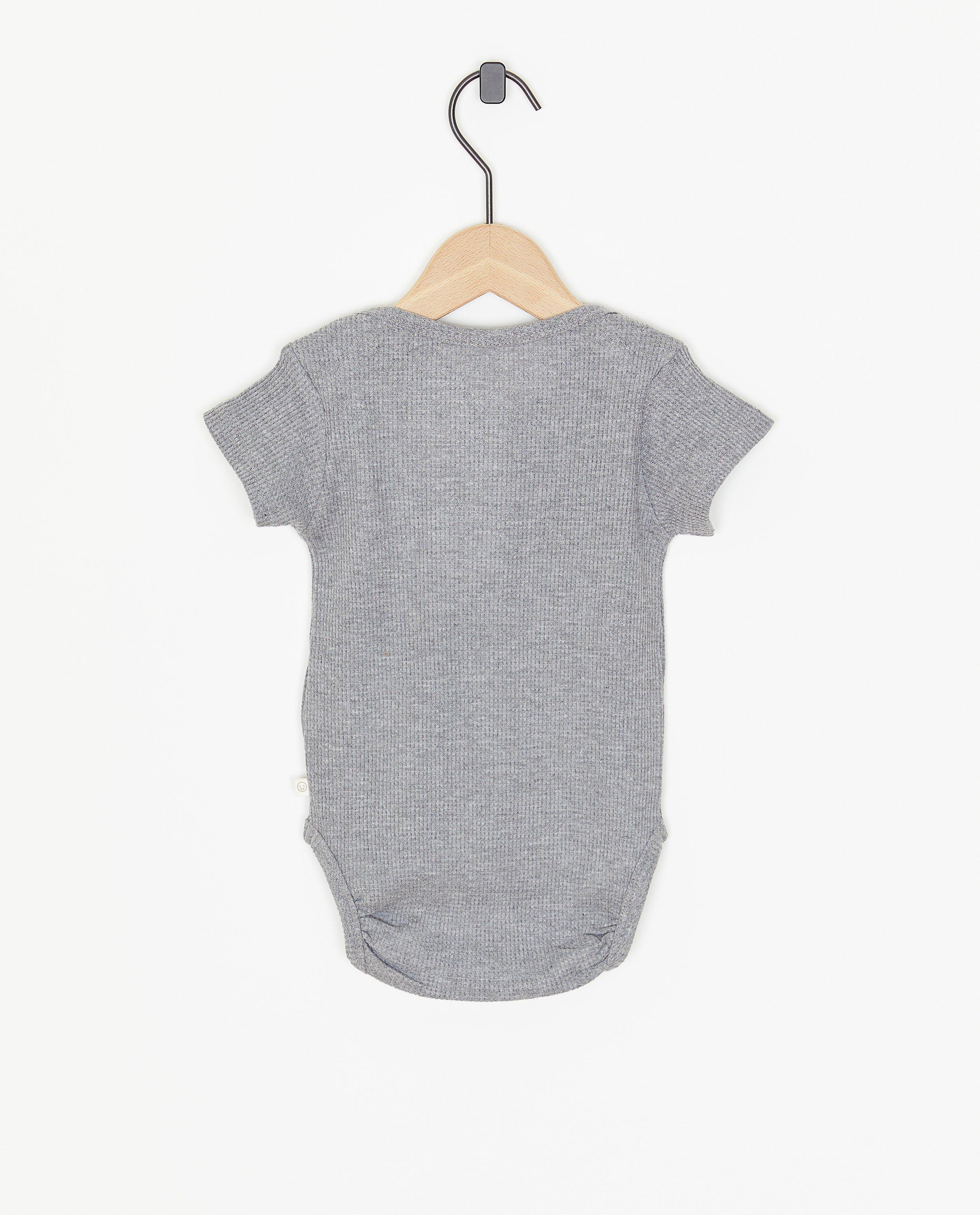 Rompers zijn het fundament van de kleerkast van jouw kleinste schat. Daarom is het belangrijk om er altijd enkele in huis te hebben! Dit rompertje heeft overslagjes op de schouders, drukknoopjes tussen de beentjes en korte mouwen. Het wafelpatroon én het strepenpatroon van deze grijze romper zorgen voor een leuke finishing touch.