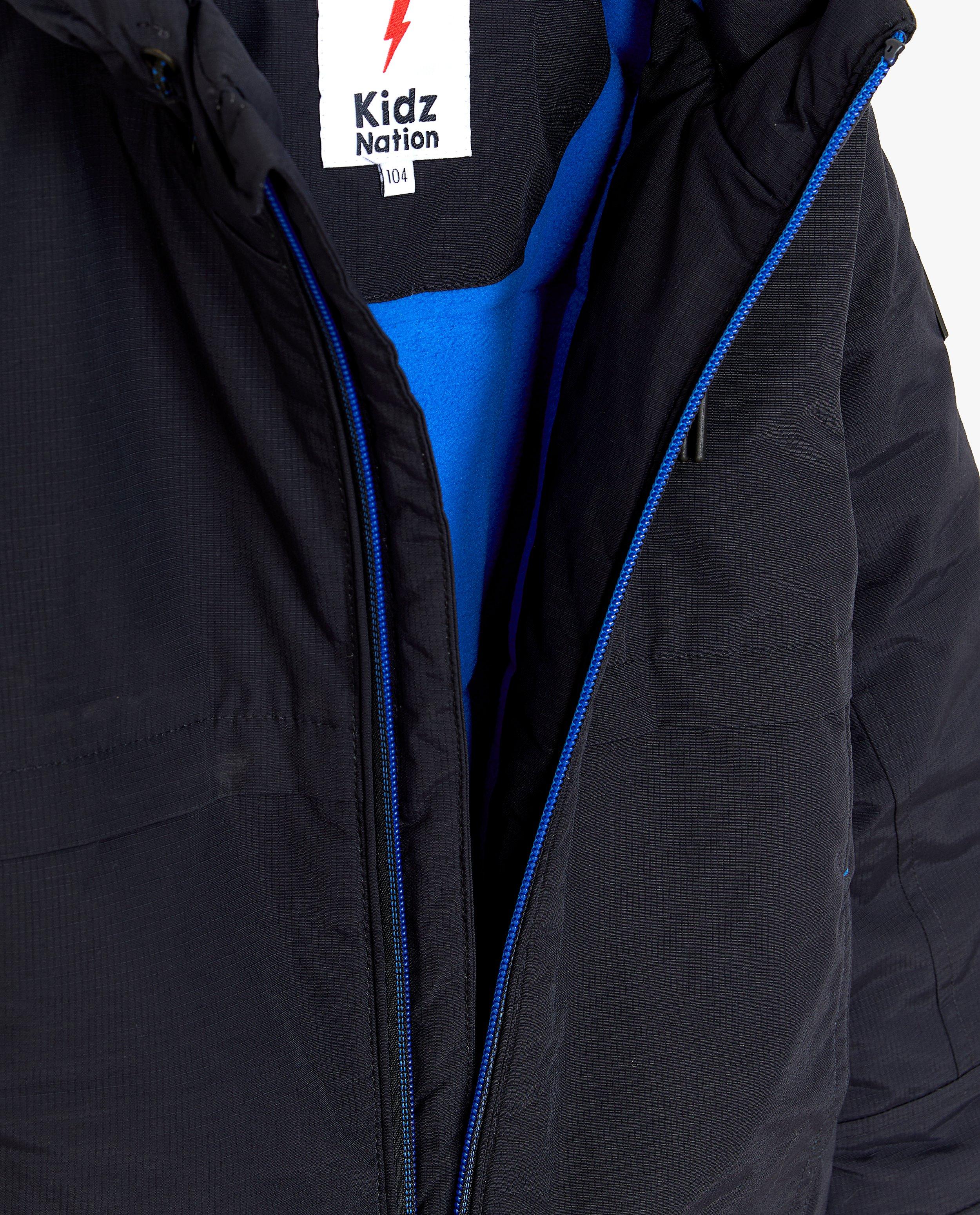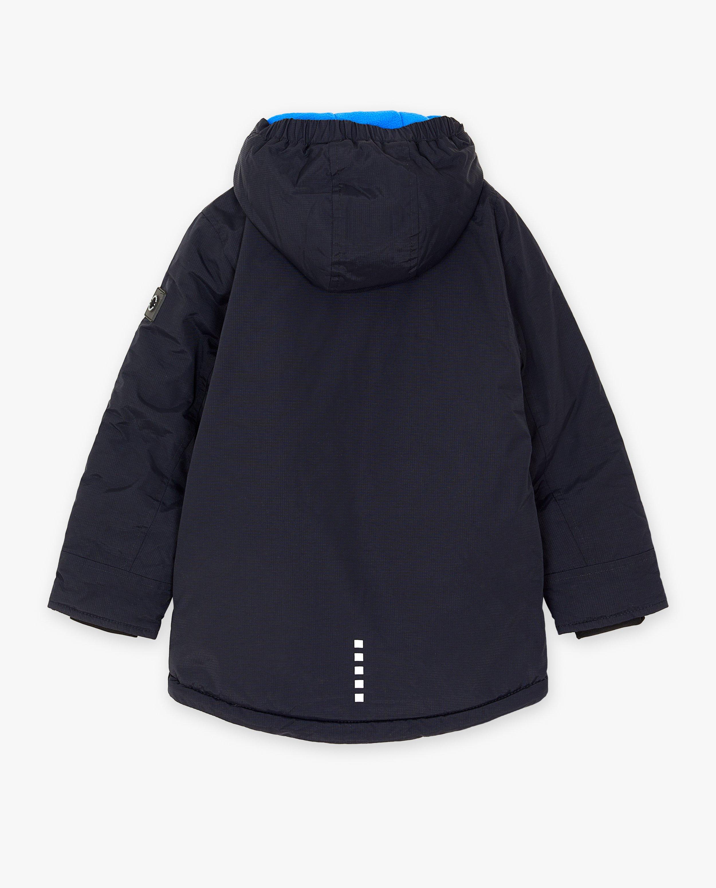 Wil jouw kleine schat niets liever dan heel de dag buiten spelen, ook wanneer het regent? Dan zal je hem met deze jas heel erg gelukkig maken! De jas heeft een mooie donkerblauwe kleur, een rits op de voorzijde en een handige kap. Op de voorzijde zitten ook drie insteekzakken, perfect voor je mini om er al zijn favoriete spullen in te steken. Binnenin is de jas gevoerd met felblauwe fleece. Die zorgt voor een kleurrijke touch!