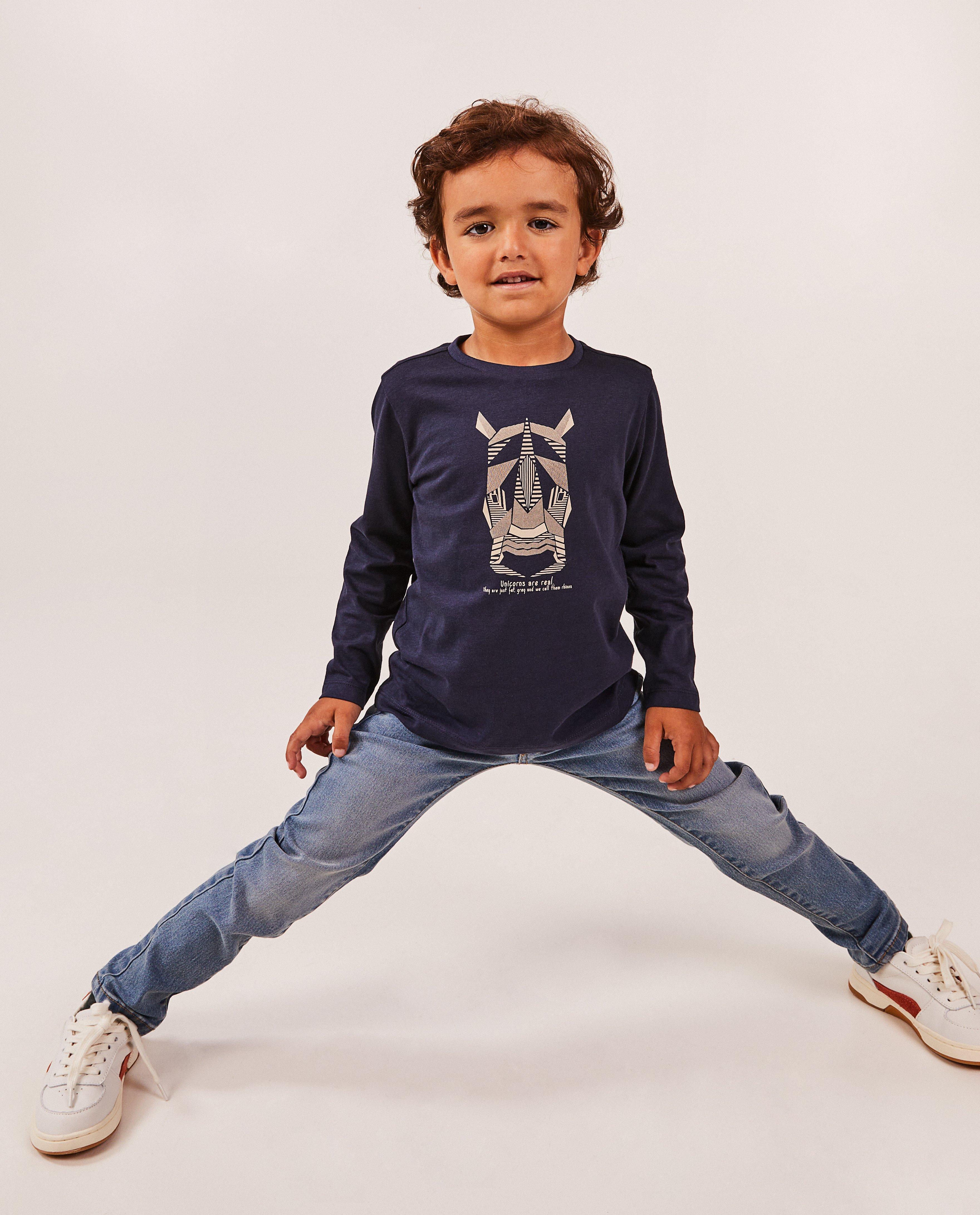 Wat is er nog beter dan een supertoffe longsleeve met een speelse dierenprint? Eentje die ook nog eens aangenaam is voor je portemonnee! Met onze BESTies-items ga je voor budgetvriendelijke kinderkleding die ideaal is voor iedere dag. Deze donkerblauwe longsleeve heeft een geometrische dierenprint op de borst. Daaronder zit een tof opschriftje.