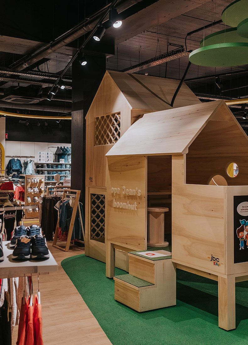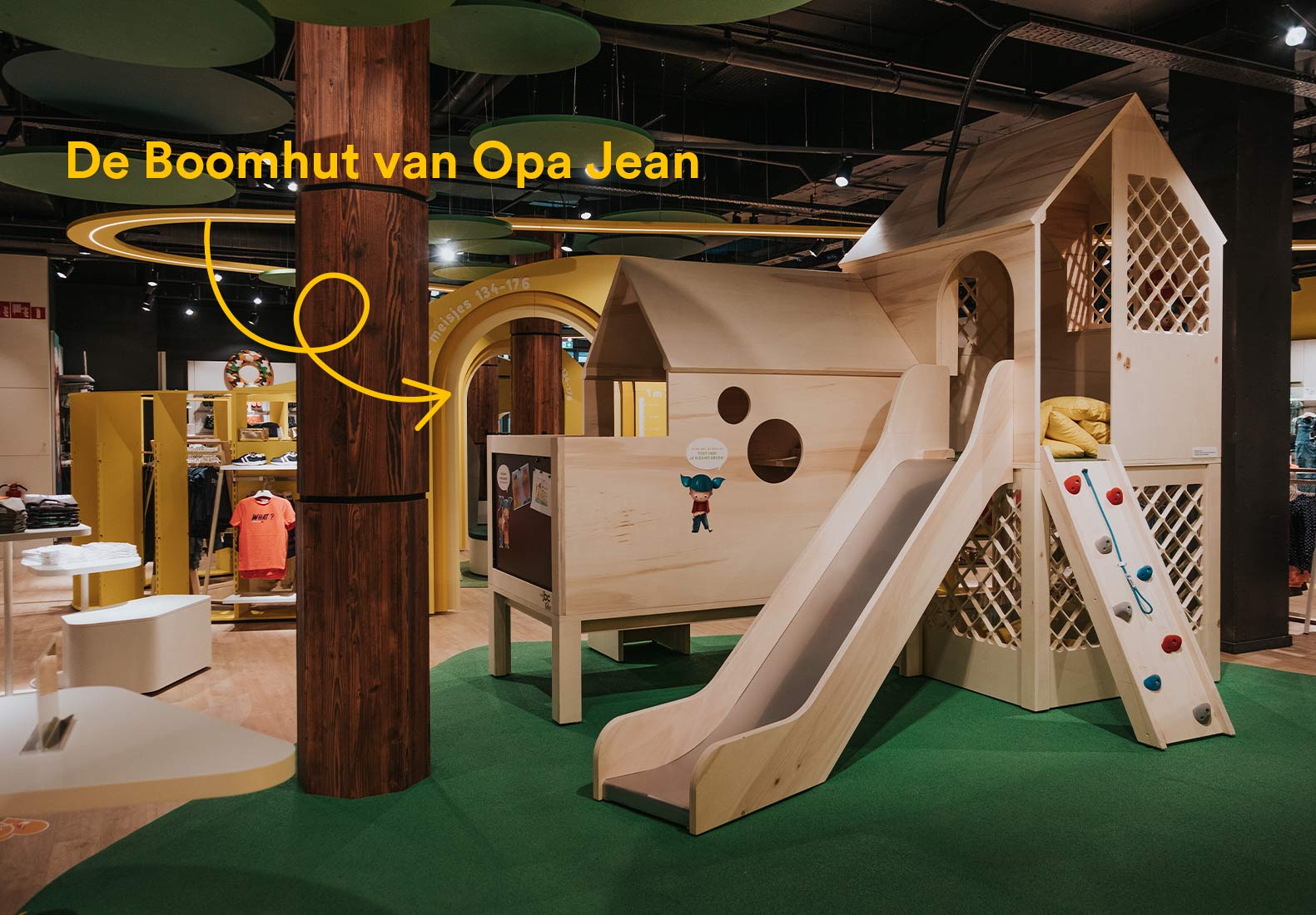 Kortom, The place to be om nieuwe outfits passen tussen de diertjes in de paskamers en ze nadien testen op de boomhut van Opa Jean. Een boomhut mét - hoe kan het ook anders - glijbaan. Na een aantal keer van de glijbaan te glijden ben je zeker dat die nieuwe broek volledig ravot-proof is! Bovendien vind je in de rekken niet alleen onze eigen kledingcollecties, maar ook die van Champion, Froy & Dind, Tumble ‘n Dry en andere exclusieve merken.