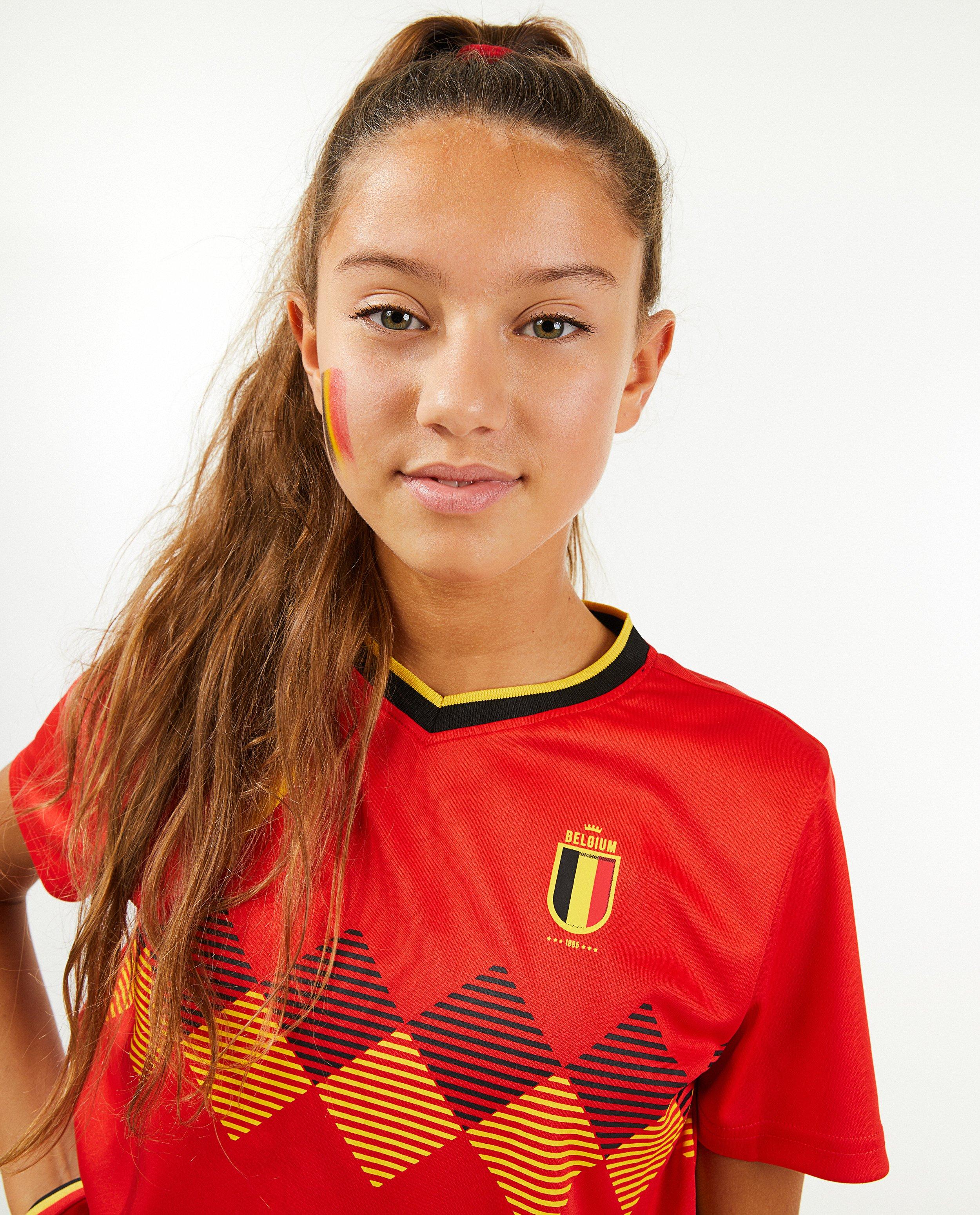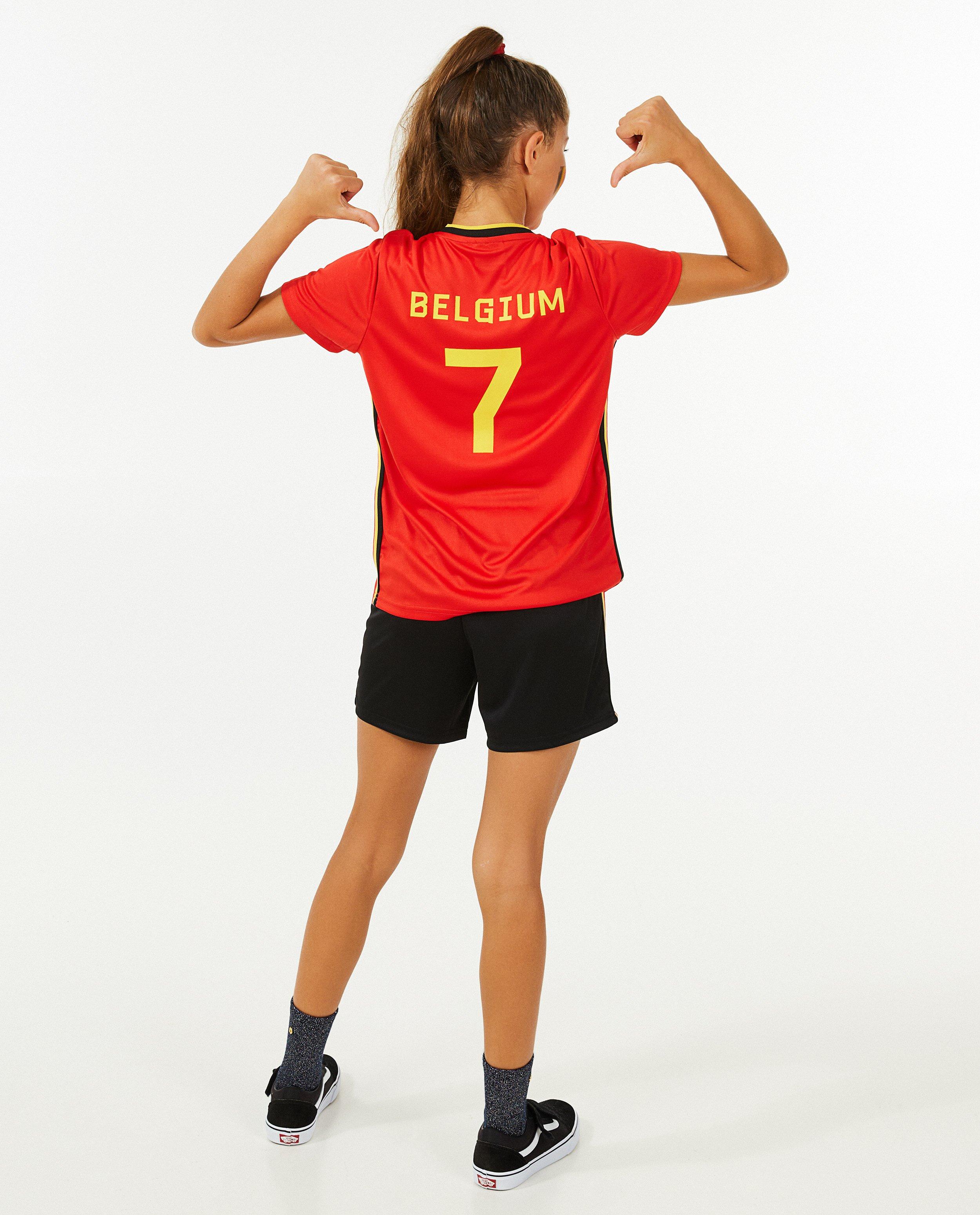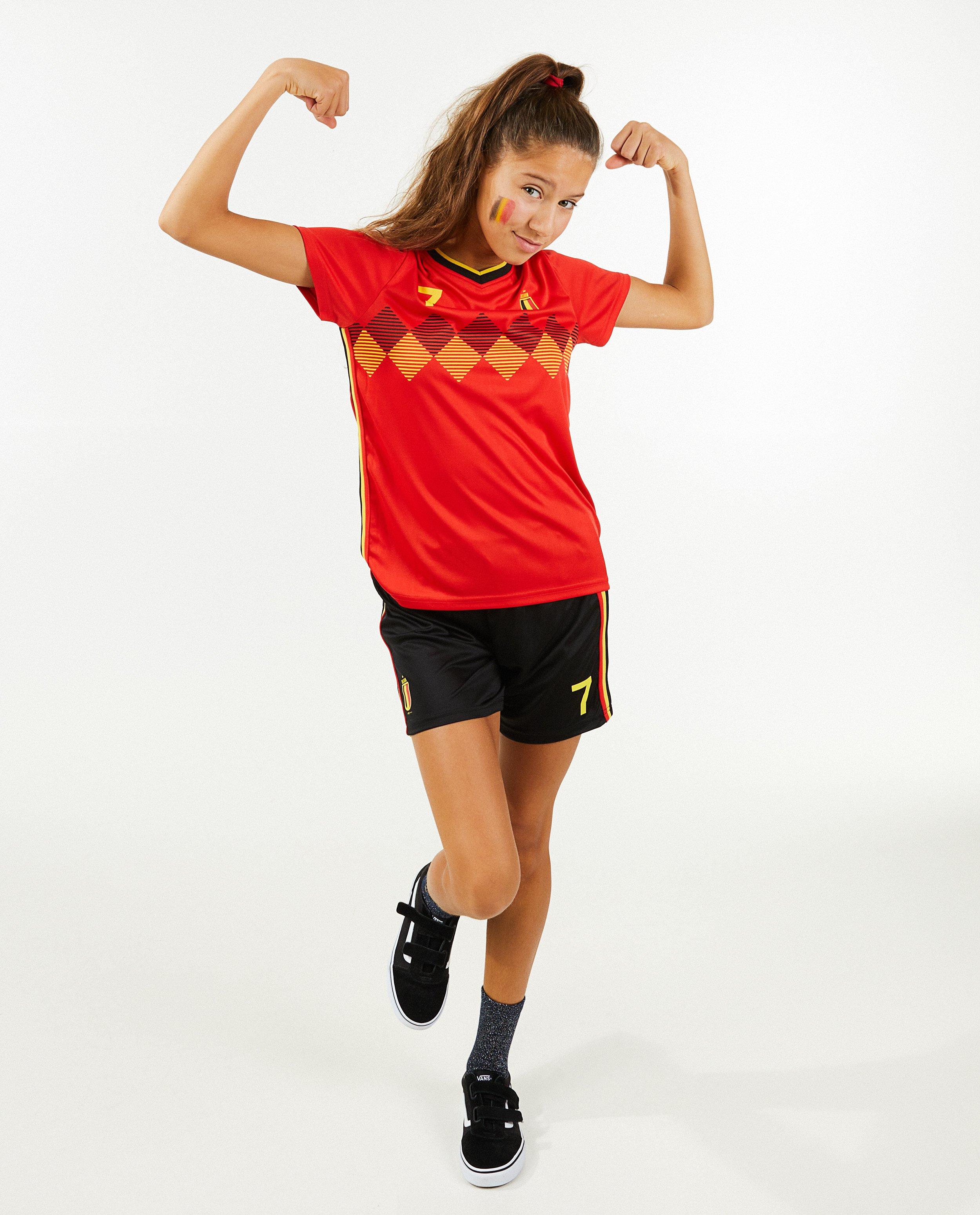 Daar gaat hij, waagt hij de gok? Hij waagt de gok! ... EN SCOOR! supporter voor de Belgen of speel als je nationale voetbalheld in deze leuke voetbaltenue met rugnummer 7 of 9. Deze zachte set heeft een T-shirt met V-hals, print op de borst en een rugnummer. De zwarte short is net als het shirt afgewerkt met een gestreepte sierbies in onze driekleur.