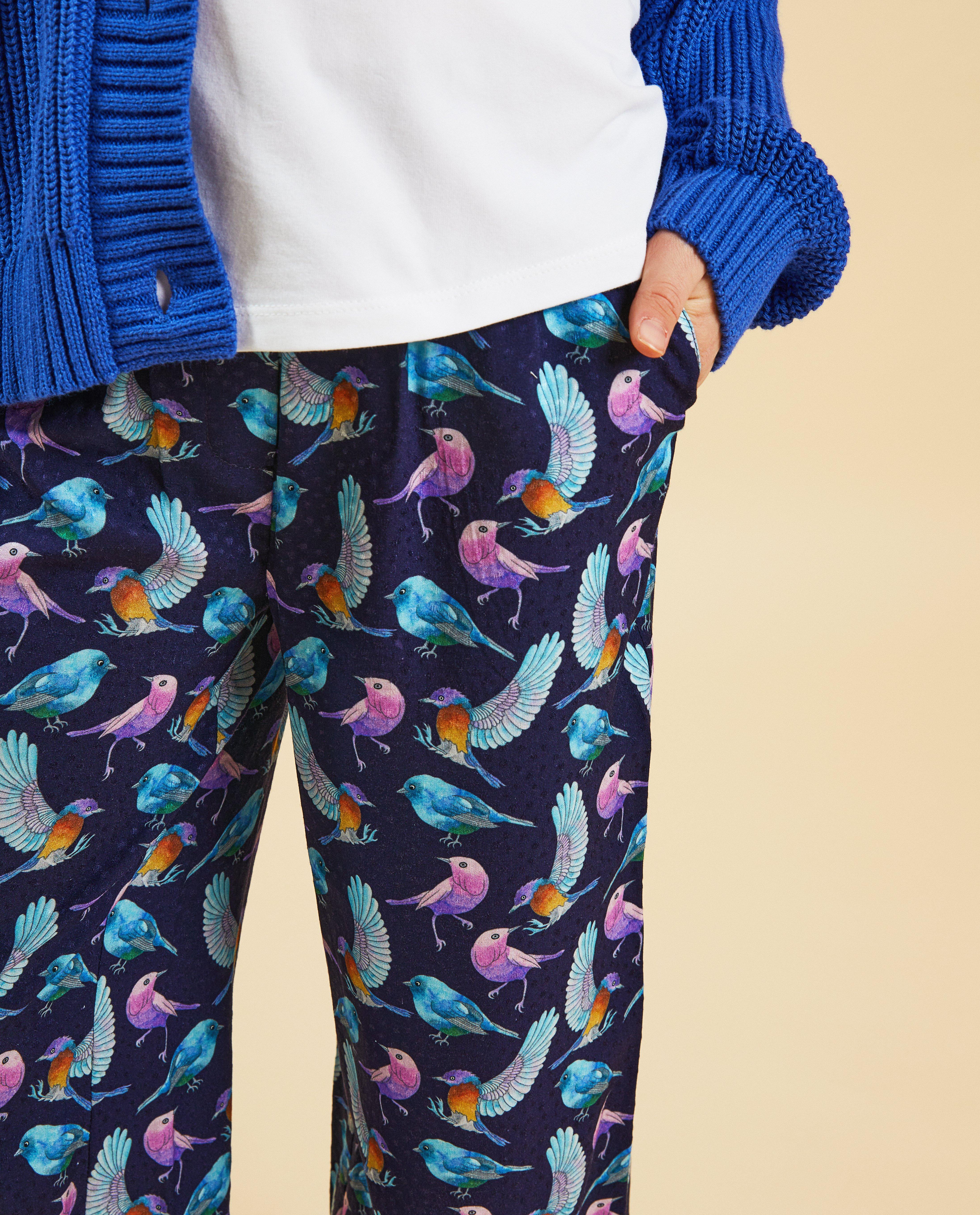 Voel je vogelvrij in deze leuke culotte, zowel op jouw speciale dag als nadien! De blauwe broek heeft brede elastische tailleband, afgewerkt met riemlussen en een allover vogelprint in allerlei leuke kleurtjes. Ben jij klaar voor je communie of lentefeest? In deze toffe collectie met witte, blauwe en neon pink kleurtjes en digitale vogelprint ben jij dat zeker!